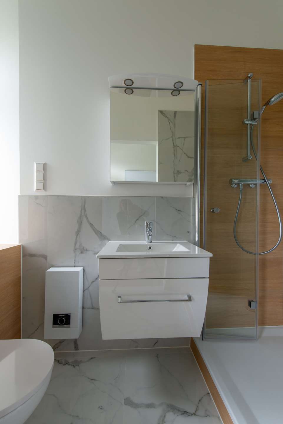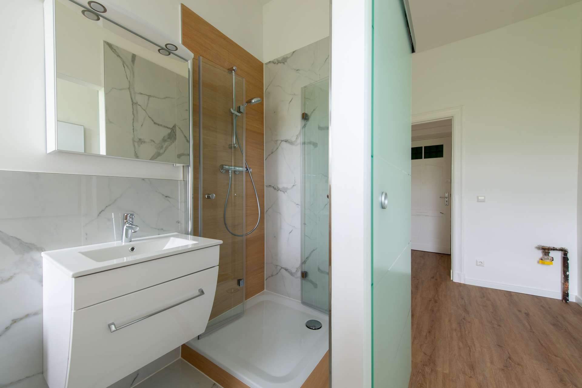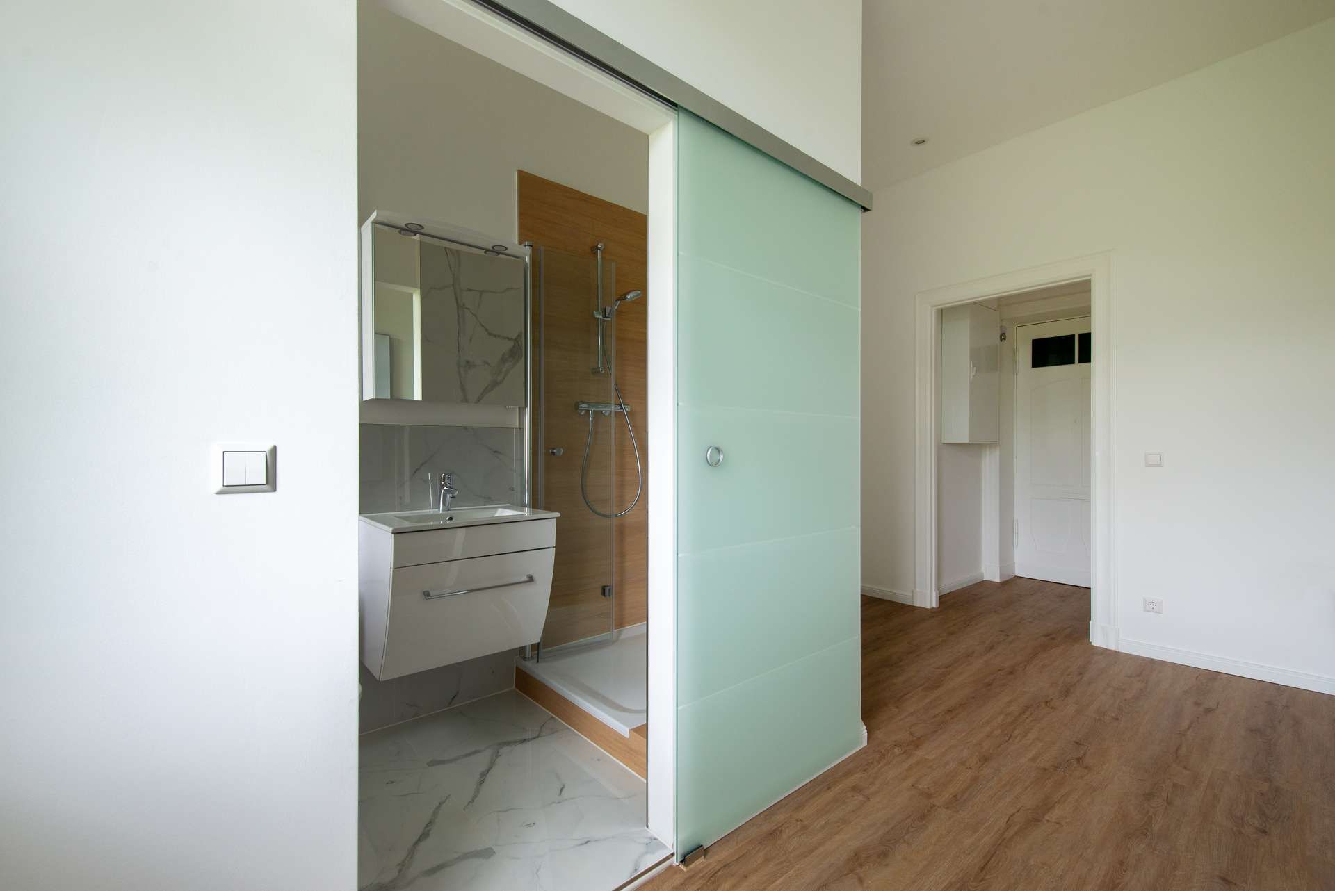 Das helle und freundliche Zimmer ist mit hochwertigem Laminatboden ausgestattet und bietet genügend Platz für eine gemütliche Sitzecke. Der separate Küchenraum, mit großem Fenster, verfügt über jede Menge Steckdosen sowie bereits vorhandene Anschlüsse für Spüle, Geschirrspüler, Waschmaschine, E-Herd und Kühlschrank. Das Badezimmer mit Tageslicht und Fenster überzeugt mit einer gutzugänglichen flachen Duschbecken mit Glastüren, einem Waschbecken mit Unterschrank, einem zum Design passenden Spiegelschrank, einem hängend ausgeführten WC, sowie einer E-Heizung mit der Handtücher getrocknet werden können.