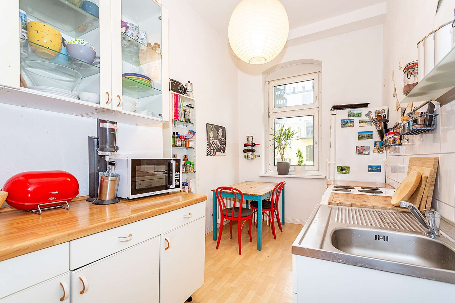 Die angebotene Immobilie befindet sich im ruhig gelegenen Hinterhaus eines 1908 erbauten Mehrfamilienhaus, das sich über 4 Etagen erstreckt. Mit dem Aufzug, der im Zwischengeschoss hält, erreichen Sie bequem das 3. Obergeschoss, indem die Wohnung liegt. Sie verfügt über eine Wohnfläche von c.a. 59,77 m², die sich auf zwei Zimmer, Küche, Bad, Flur und Balkon verteilt. Die Wohnung wurde 2005 komplett renoviert. Das hell geflieste Tageslichtbad ist mit einer Wanne ausgestattet. 2019 wurden die Fliesen im Bad sowie die Fenster beider Wohnräume erneuert. Im selben Jahr wurde der Balkon angebaut. In der Küche wurde ein PVC-Boden in Laminatoptik verlegt. Durch den Rest der Wohnung zieht sich ein schöner Dielenboden. Der Wohneinheit ist ein Keller zugewiesen. Im Hinterhof gibt es die Möglichkeit, Fahrräder abzustellen. Die Wohnanlage ist gut gepflegt und auf einem modernen Stand.
