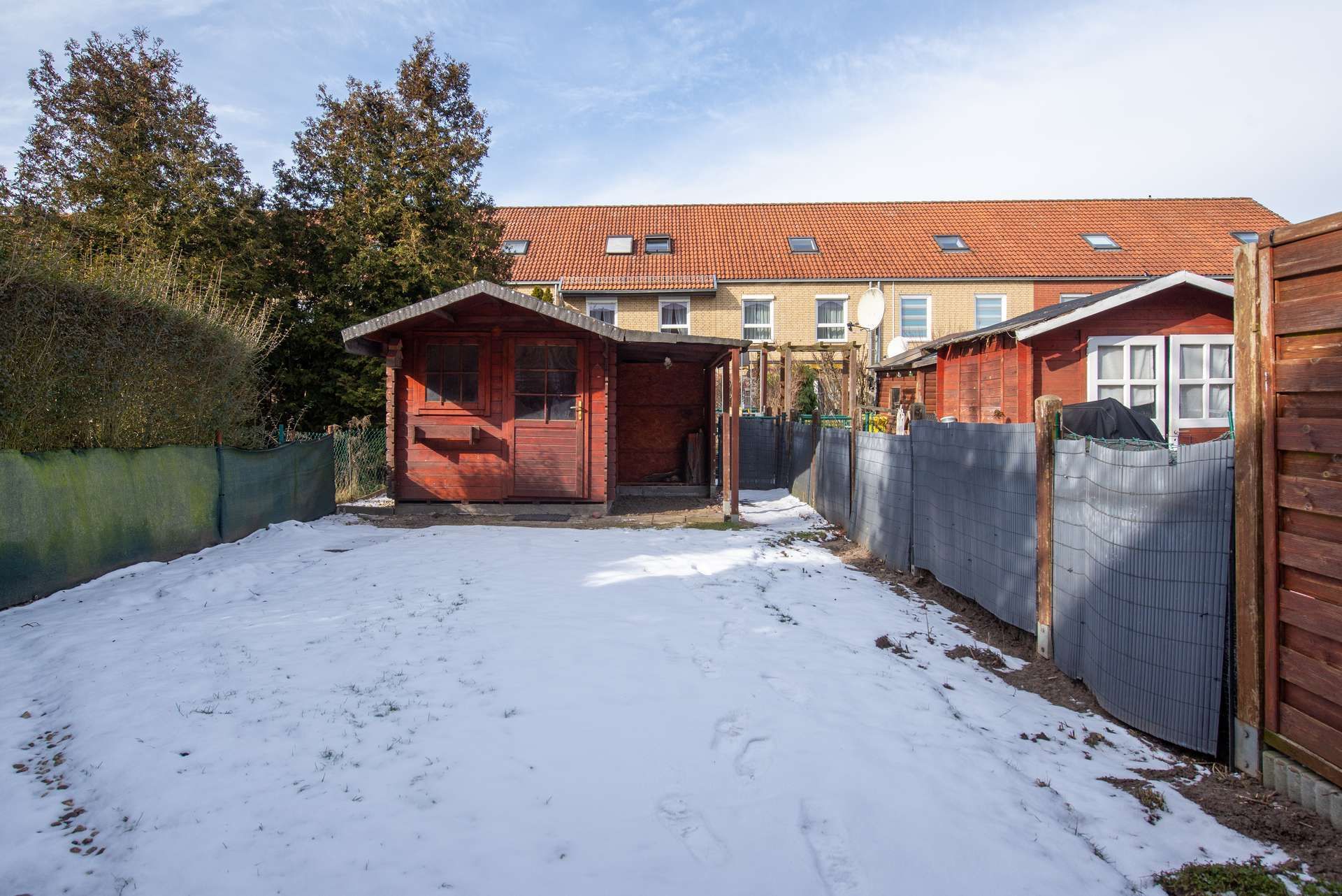 Im Außenbereich erwartet Sie eine kleine, geflieste Terrasse mit rund 15 m² Fläche - ideal für entspannte Stunden im Freien. Ein separater Schuppen bietet praktischen Stauraum für Gartengeräte und Gartenmöbel.
