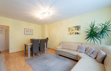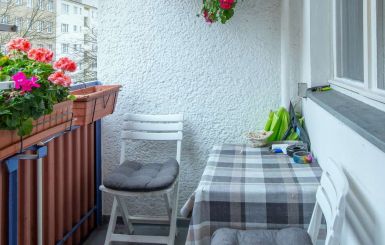 Der Wohnbereich ist hell und einladend gestaltet und bietet direkten Zugang zu einem Südbalkon. Hier lässt sich wunderbar die frische Luft genießen, und der Balkon erweitert den Wohnraum nach außen.
