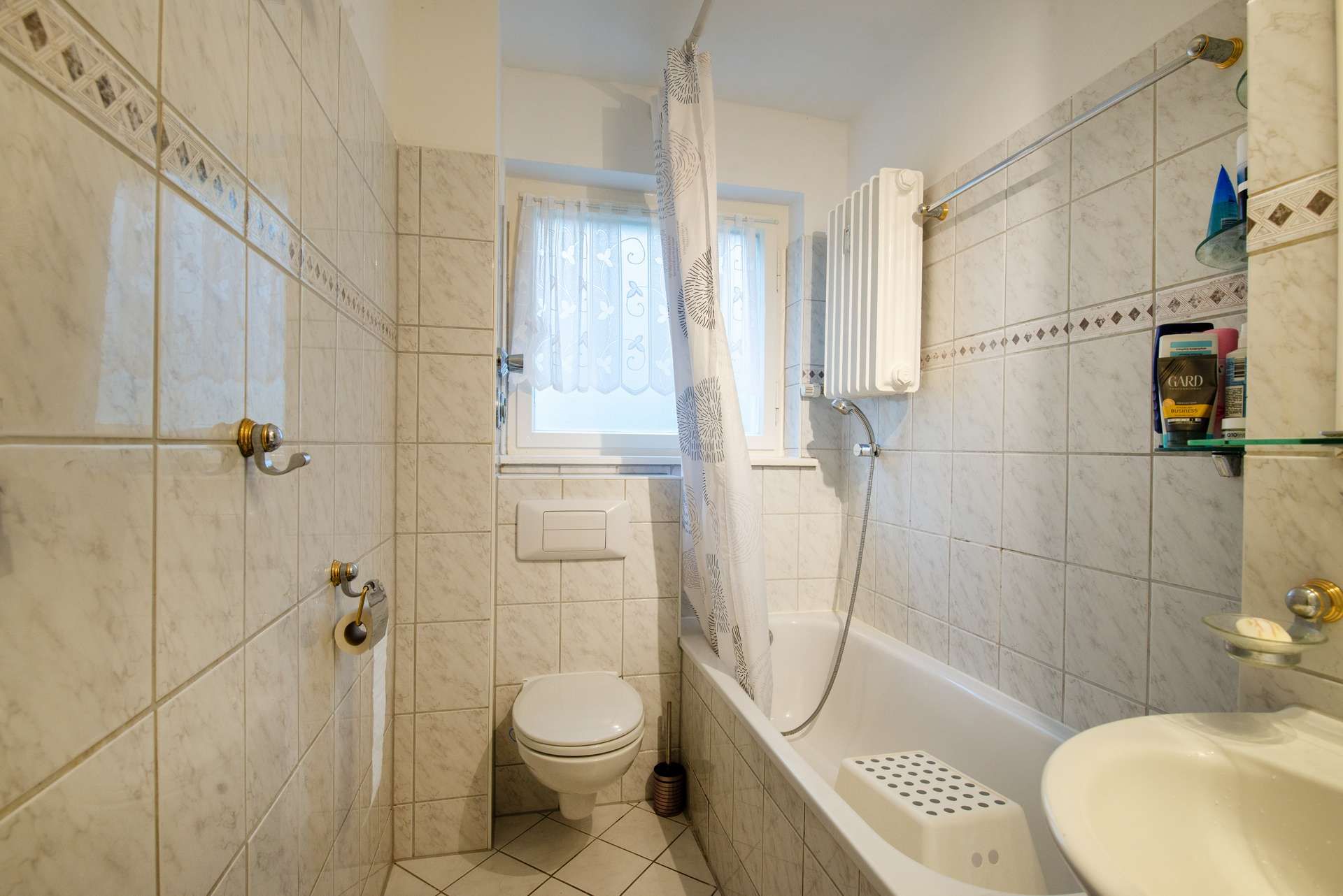 Das Tageslichtbad, ausgestattet mit einer Badewanne und hellen Fliesen, verleiht dem Raum eine zeitlose und gepflegte Optik.