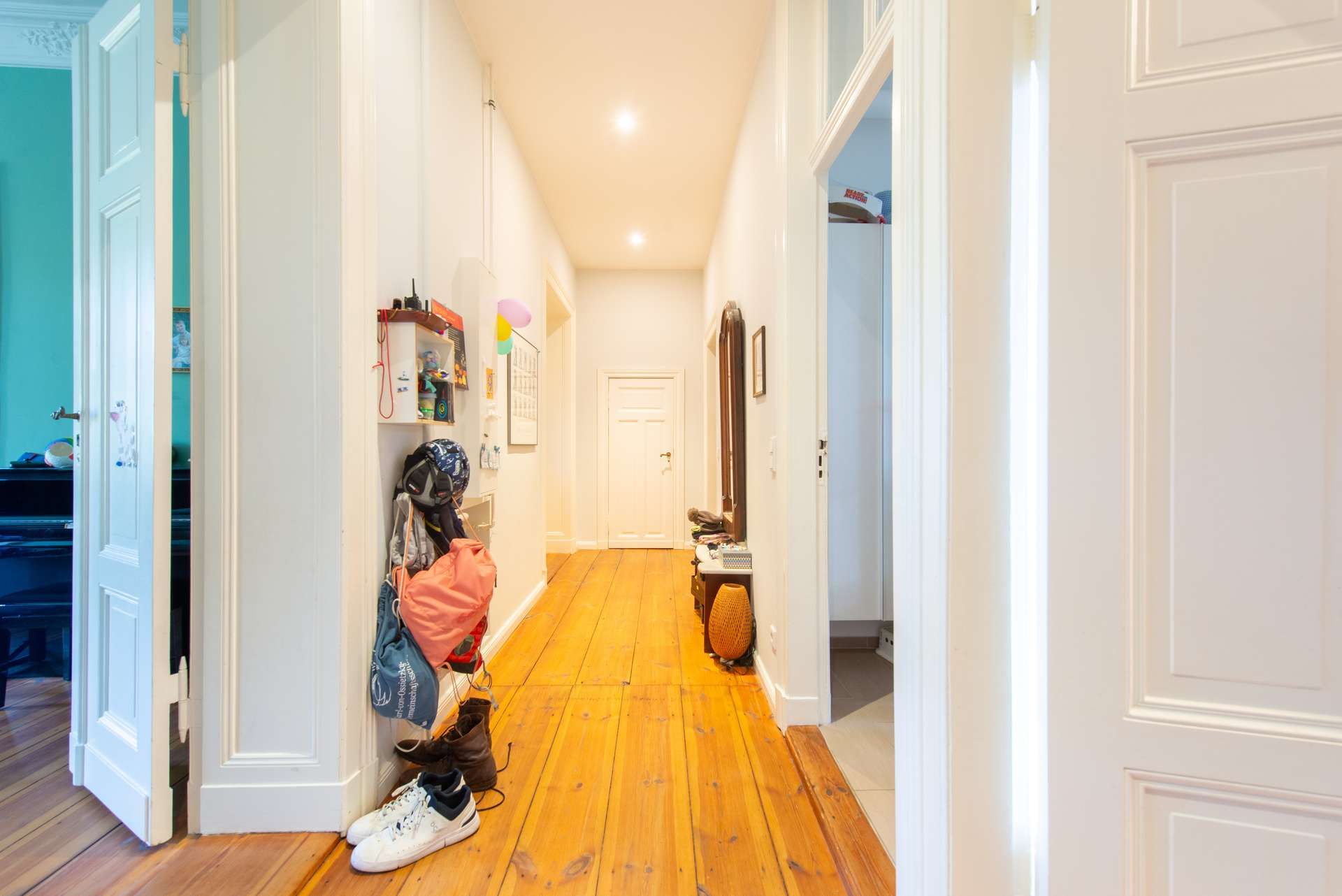 Auf rund 133 m² Wohnfläche verteilt sich eine durchdachte Grundrissgestaltung: Über den einladenden Flur gelangt man auf der einen Seite zu drei prachtvollen, miteinander verbundenen Zimmern zur Straßenseite – ideal als Wohn-, Ess- oder Arbeitsbereiche nutzbar. Auf der anderen Seite befinden sich ein separates Arbeitszimmer sowie ein Badezimmer.