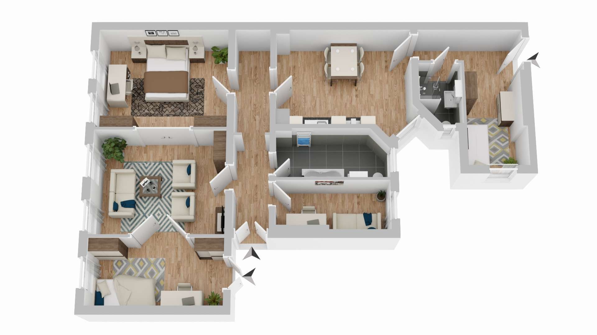 Das Herzstück der Wohnung bildet die großzügige Wohnküche, die ausreichend Platz für gemeinsame Stunden mit Familie und Freunden bietet. Von hier aus führt der Weg in ein weiteres Schlafzimmer im Seitenflügel, das direkt an ein zweites, en suite angeschlossenes Badezimmer grenzt. Künftig wird die Wohnküche zudem direkten Zugang zum geplanten Balkon im ruhigen Innenhof erhalten – ein besonderes Plus an Freiraum und Privatsphäre.