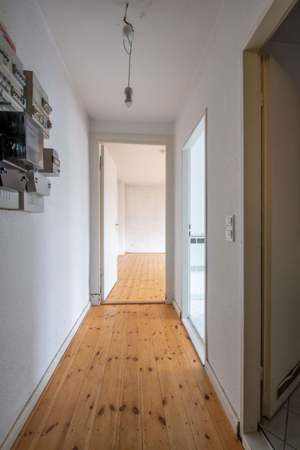 Flur und Wohnzimmer sind mit einem gut erhaltenen Dielenboden ausgestattet. Das Hauptzimmer verfügt über zwei großzügige Fensterfronten, die für eine gute Belichtung sorgen.