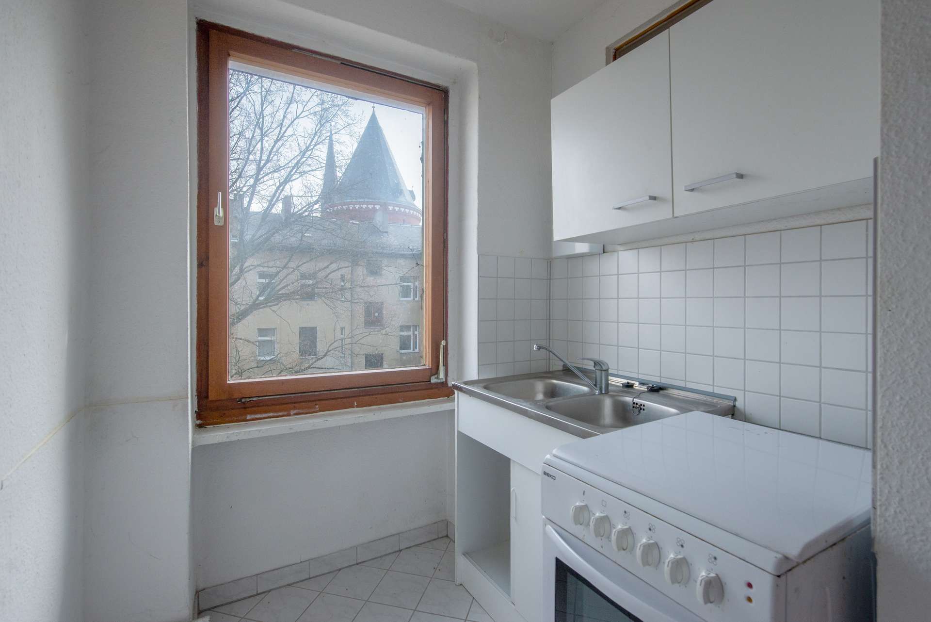 Der Küchenbereich ist gefliest und derzeit mit einer Basisausstattung (Spültisch und Herd) versehen. Ein großes Fenster bietet einen direkten Blick in den Innenhof sowie auf den nahegelegenen Wasserturm.