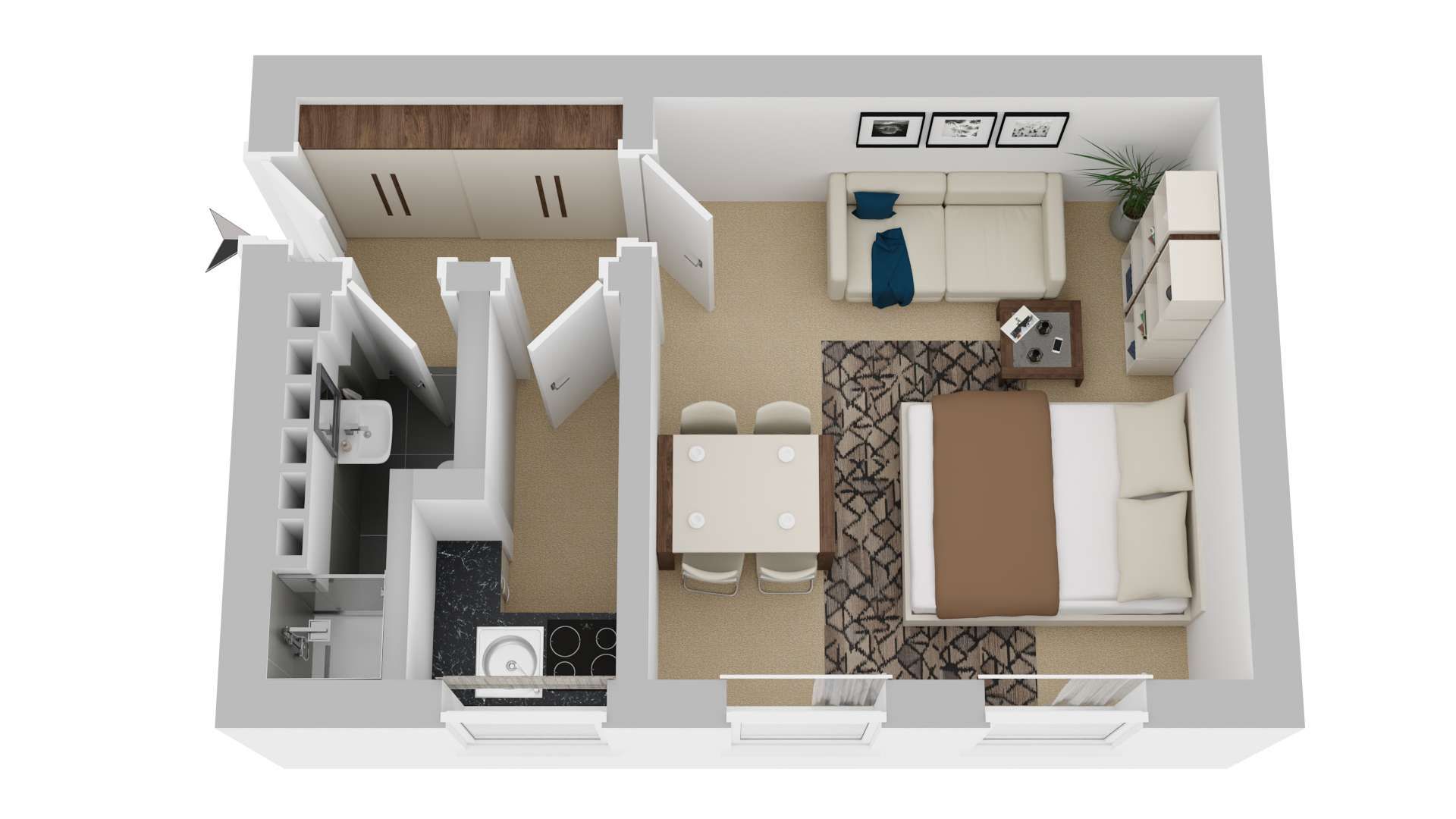 Die Wohneinheit befindet sich im 4. Obergeschoss des Seitenflügels und umfasst eine Wohnfläche von ca. 25,37 m². Der Grundriss ist funktional gestaltet: Alle Räume sind zentral vom Flur aus begehbar, was eine effiziente Flächennutzung ermöglicht.