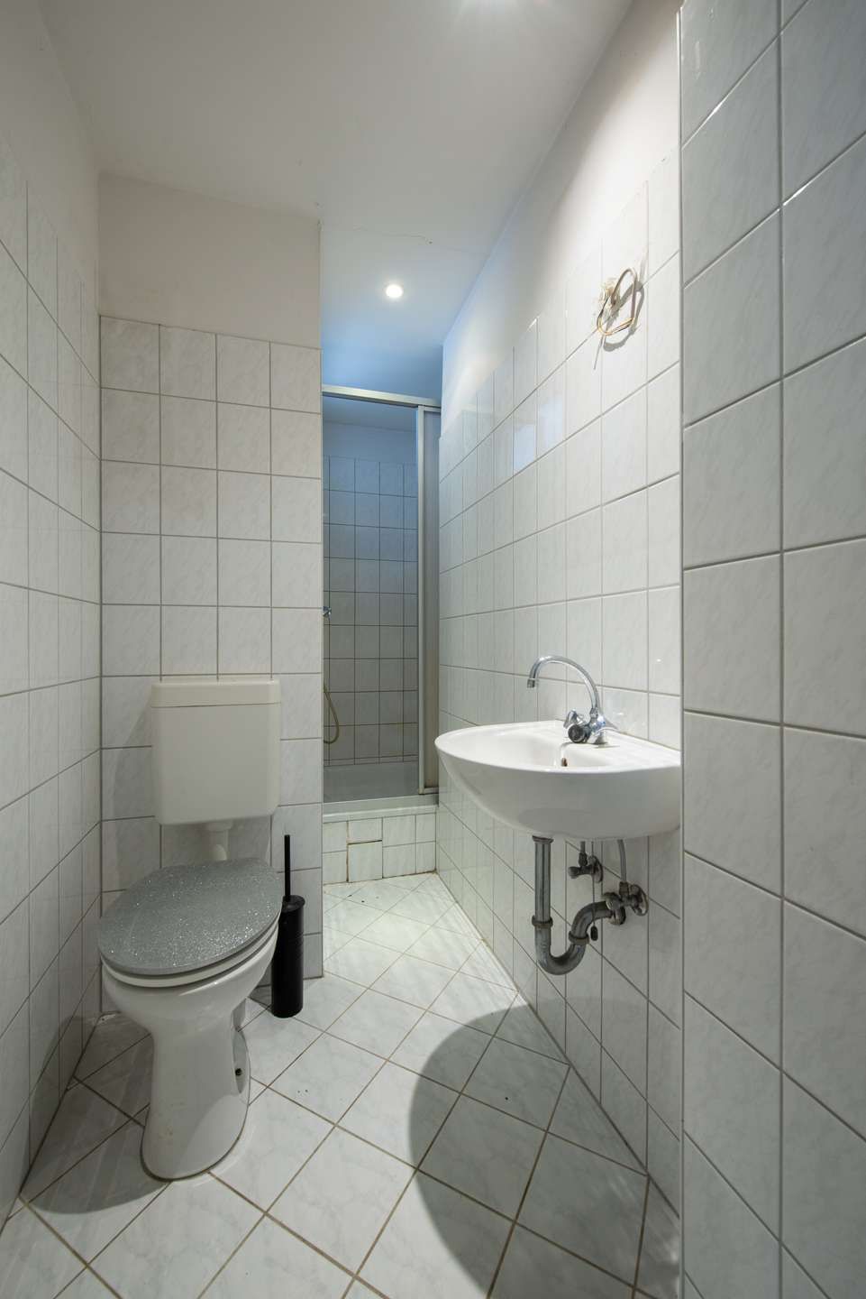 Rechts vom Flur abgehend befindet sich das geflieste Duschbad, welches über ein kleines Tageslichtfenster verfügt.