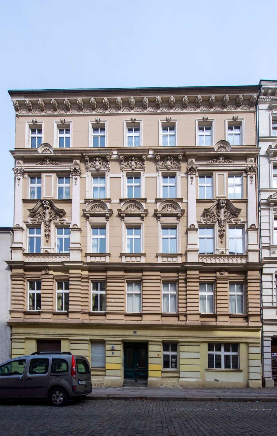 Hinter der einzigartigen und charakteristischen Fassade verbirgt sich ein klassischer Berliner Altbau mit einem repräsentativen Vorderhaus und einem charmanten Seitenflügel. Mit jeweils 10 Wohneinheiten im Vorderhaus und 9 Wohneinheiten im Seitenflügel entsteht eine angenehme, nachbarschaftliche Atmosphäre.