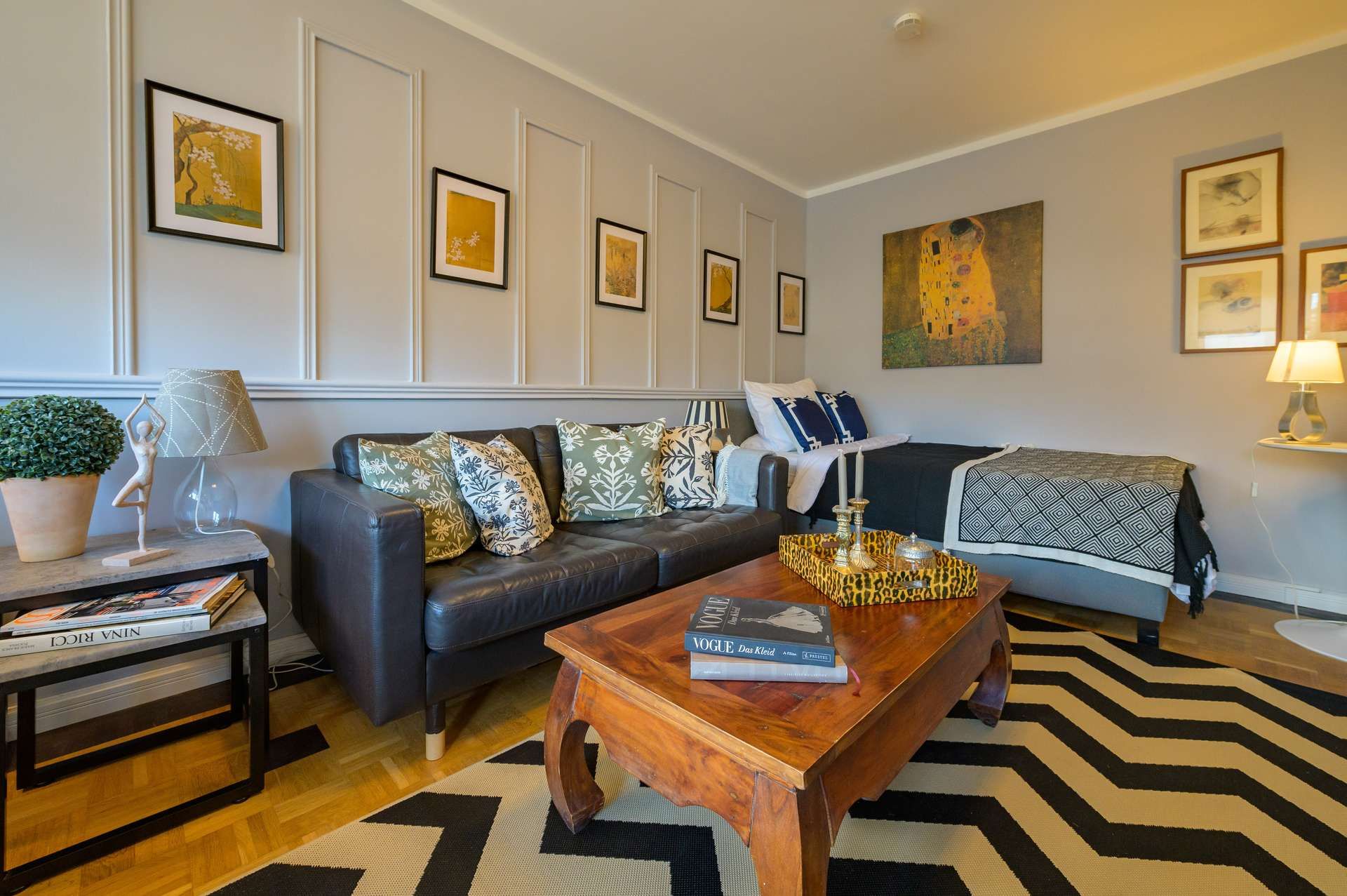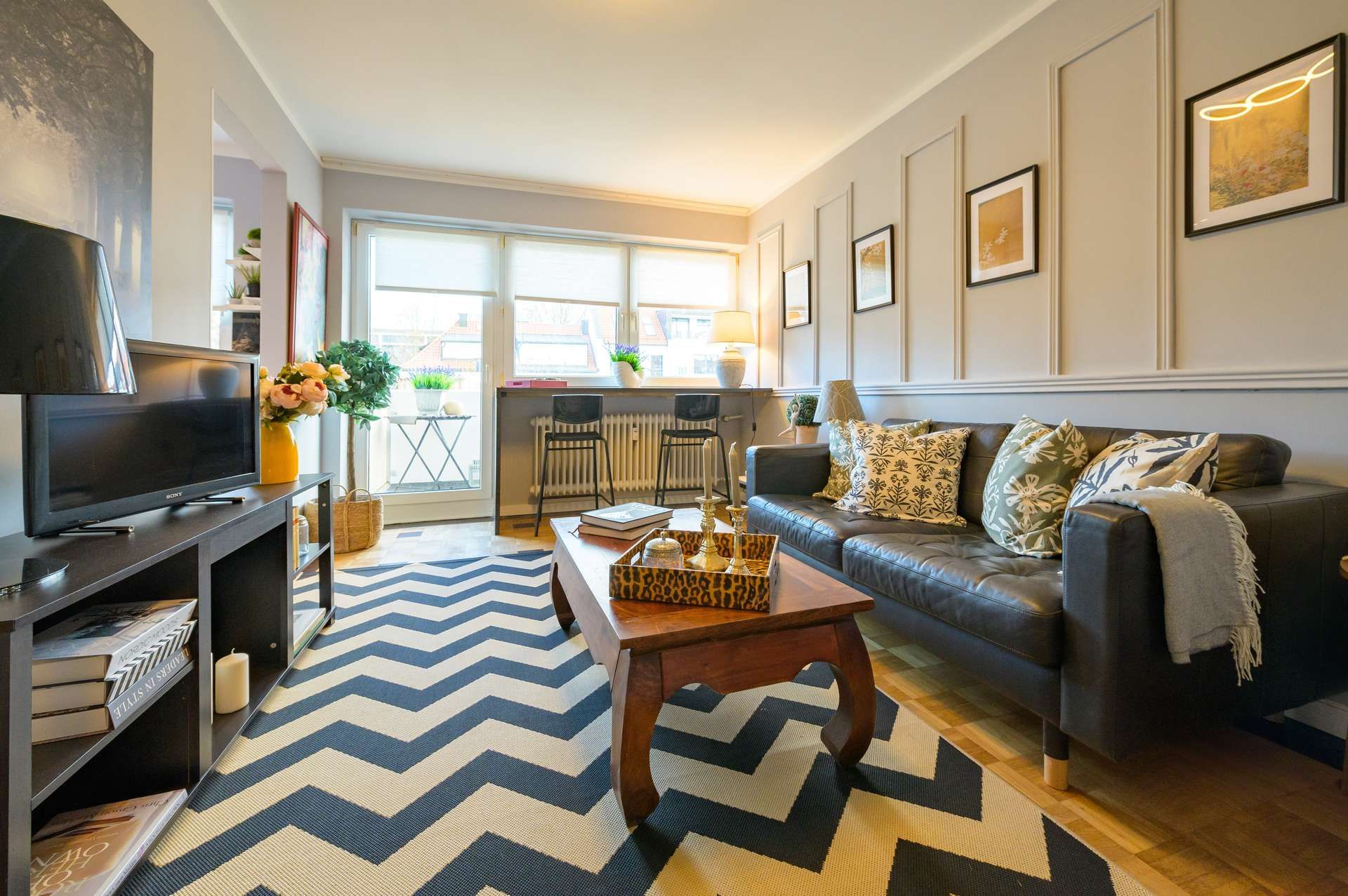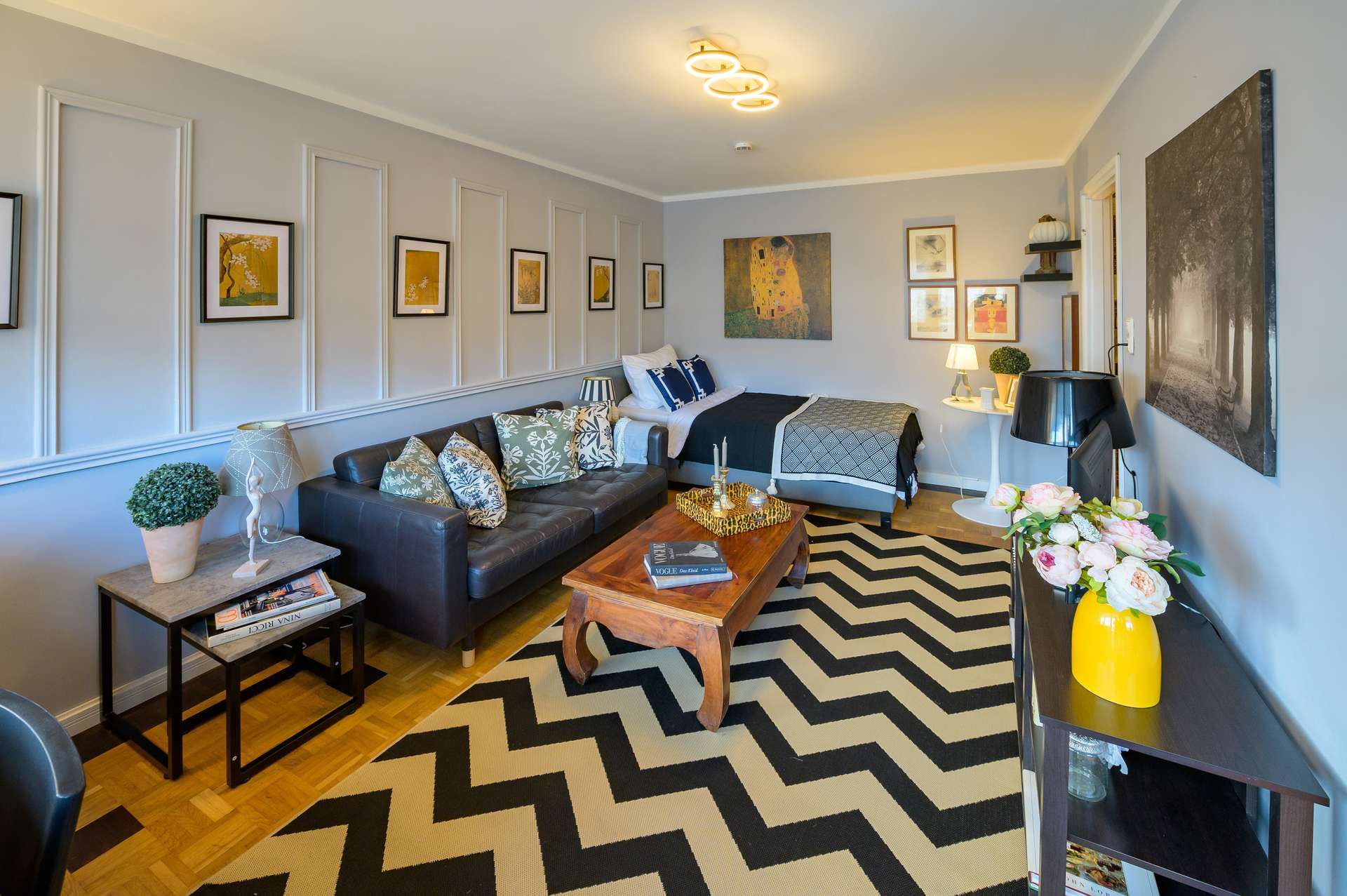 Die Immobilie umfasst ein stilvoll eingerichtetes Zimmer, eine separate Küche, ein modernes mit Marmor ausgestattetes Badezimmer sowie einen Balkon mit Blick in den ruhigen Garten.