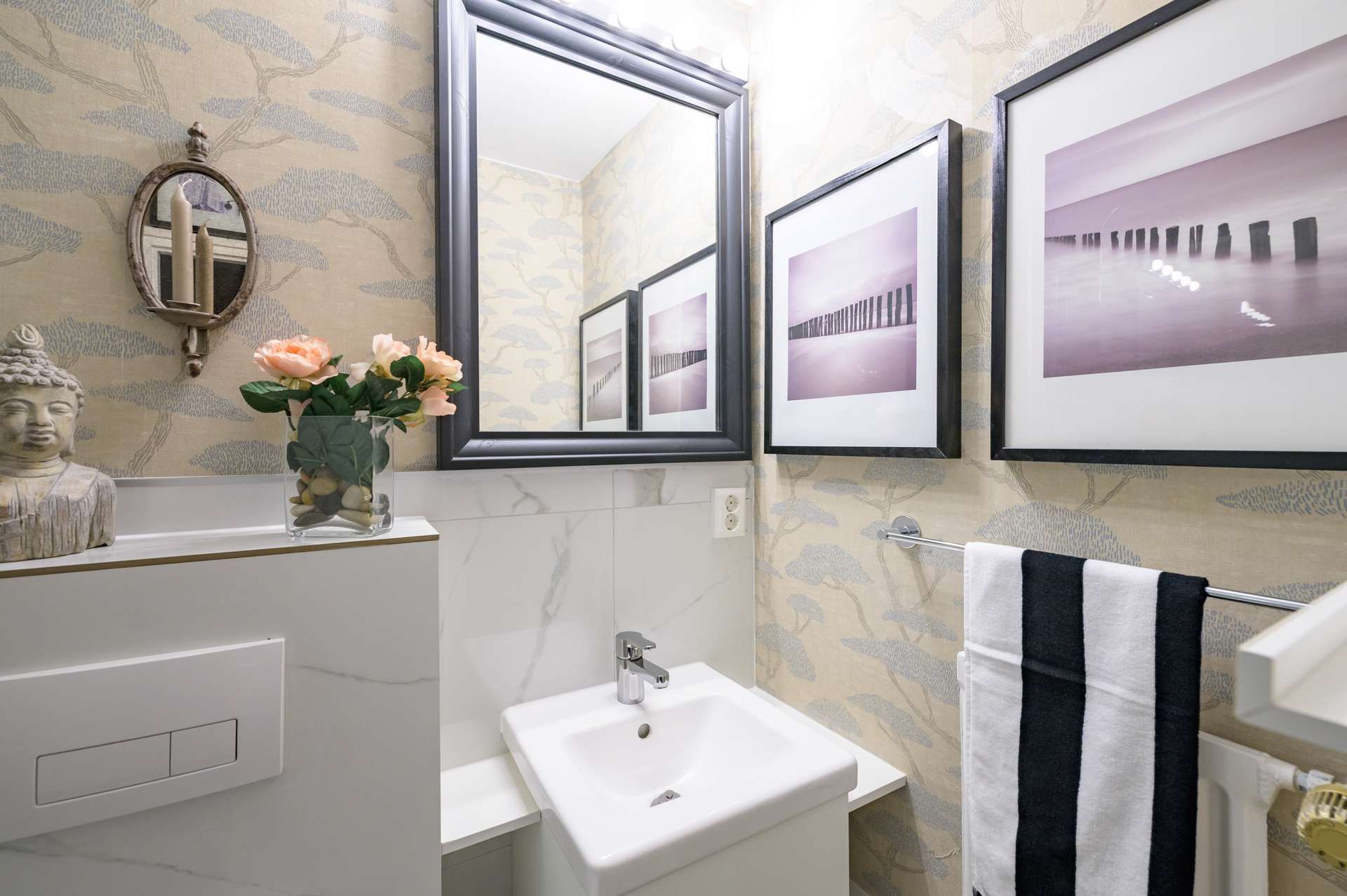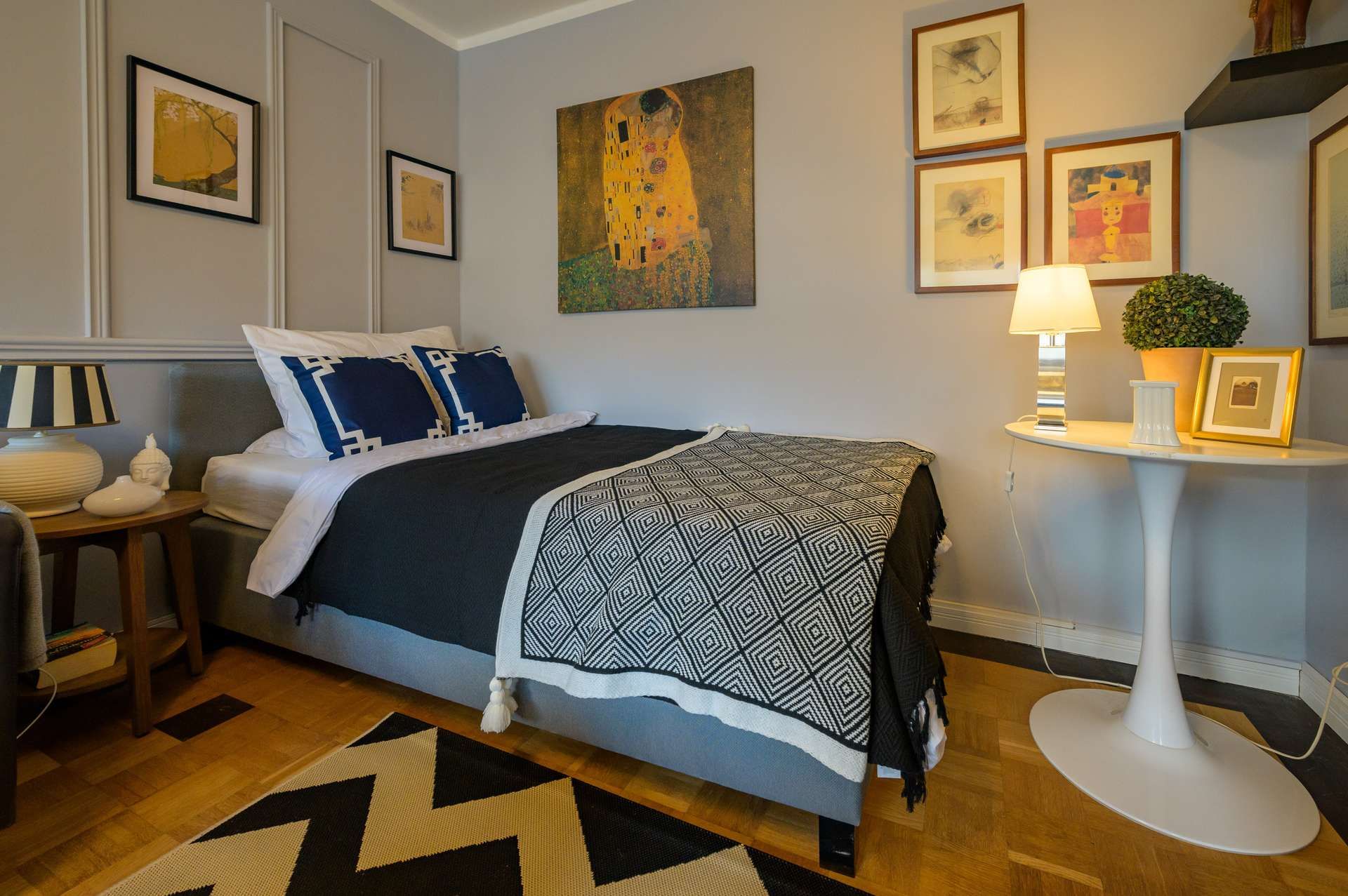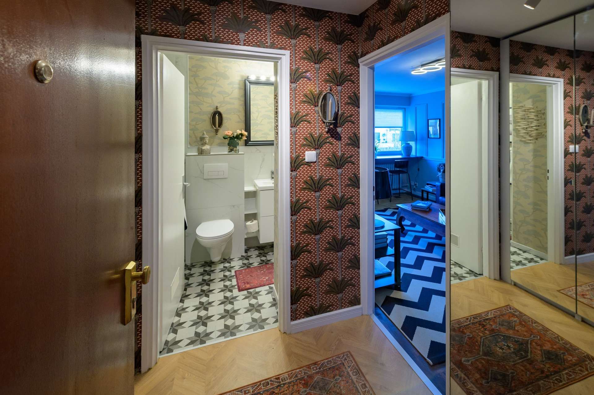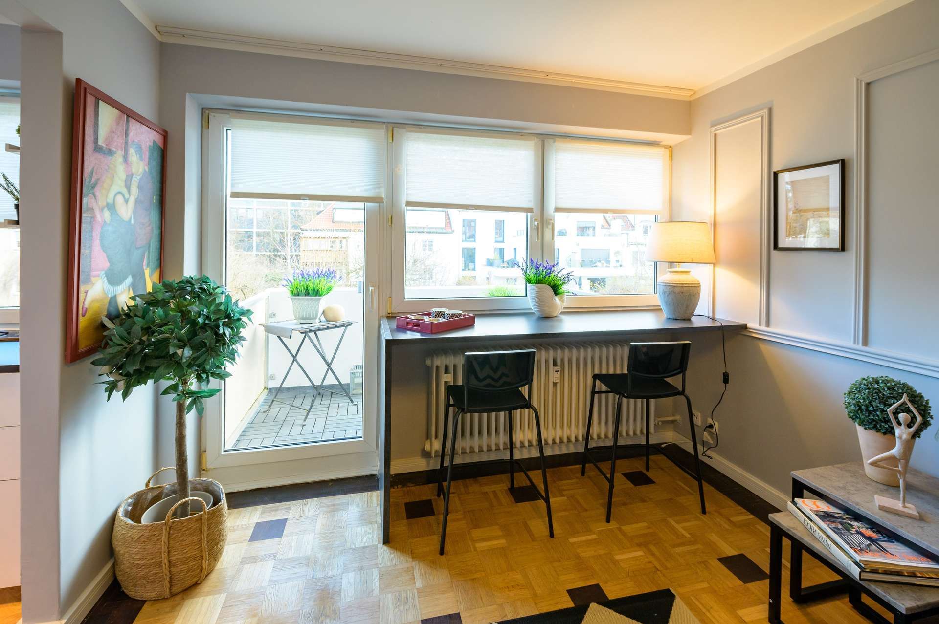 Die Immobilie umfasst ein stilvoll eingerichtetes Zimmer, eine separate Küche, ein modernes mit Marmor ausgestattetes Badezimmer sowie einen Balkon mit Blick in den ruhigen Garten.