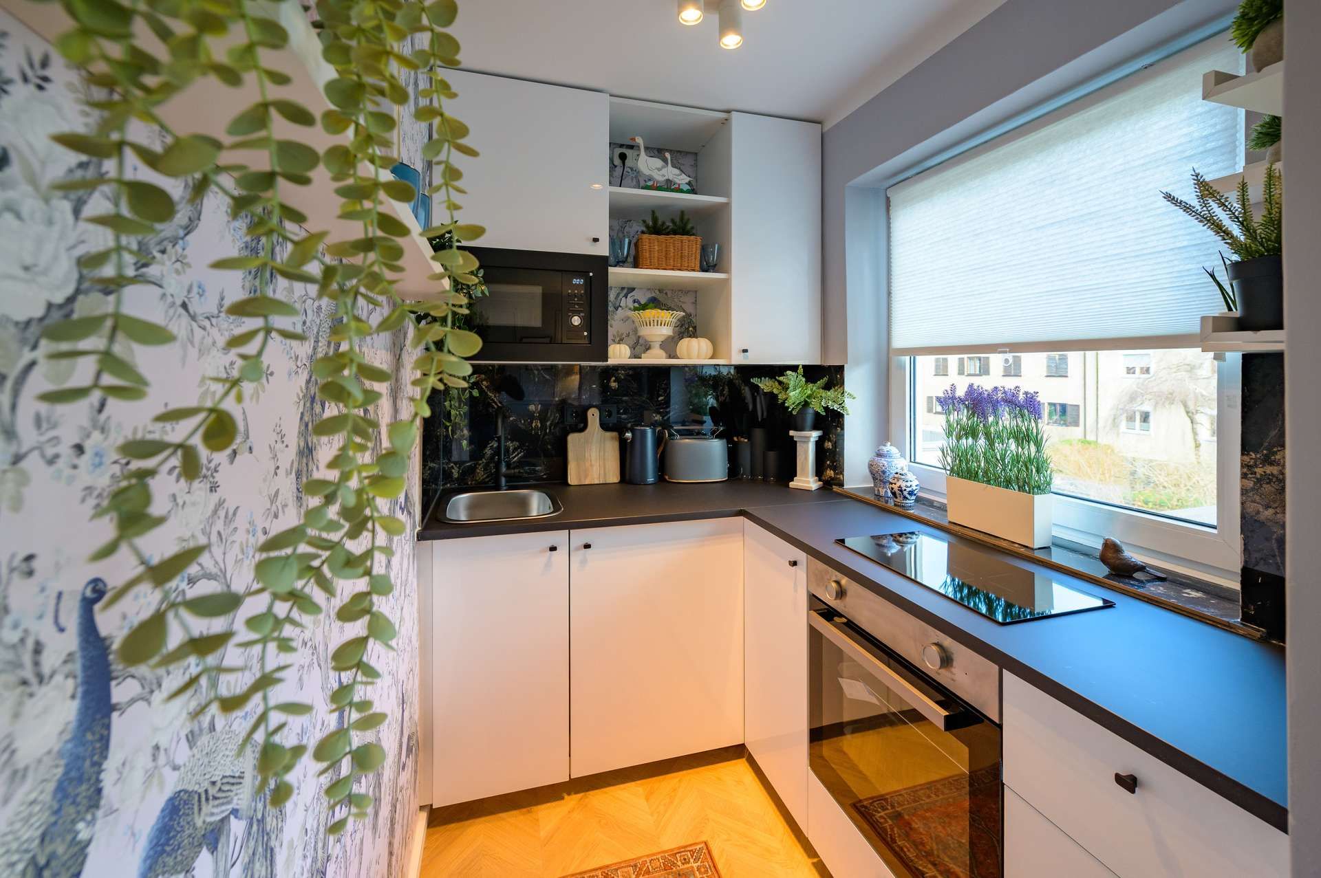 Die Küche ist voll ausgestattet mit einer modernen Einbauküche, inklusive Mikrowelle, Induktionskochfeld sowie vollständigem Küchenzubehör.