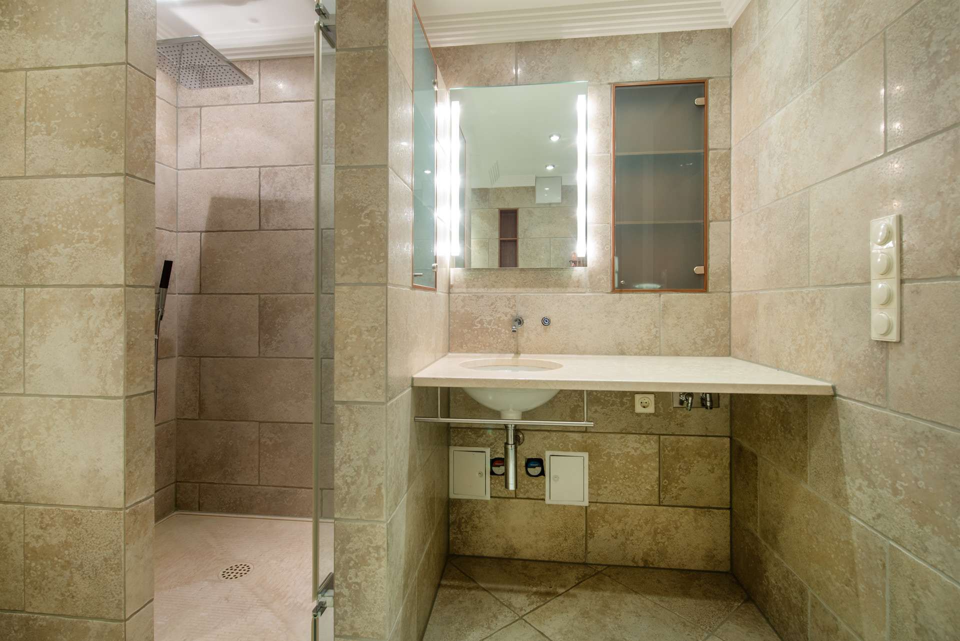 - Badezimmer mit Badewanne, Dusche und Natursteinfliesen