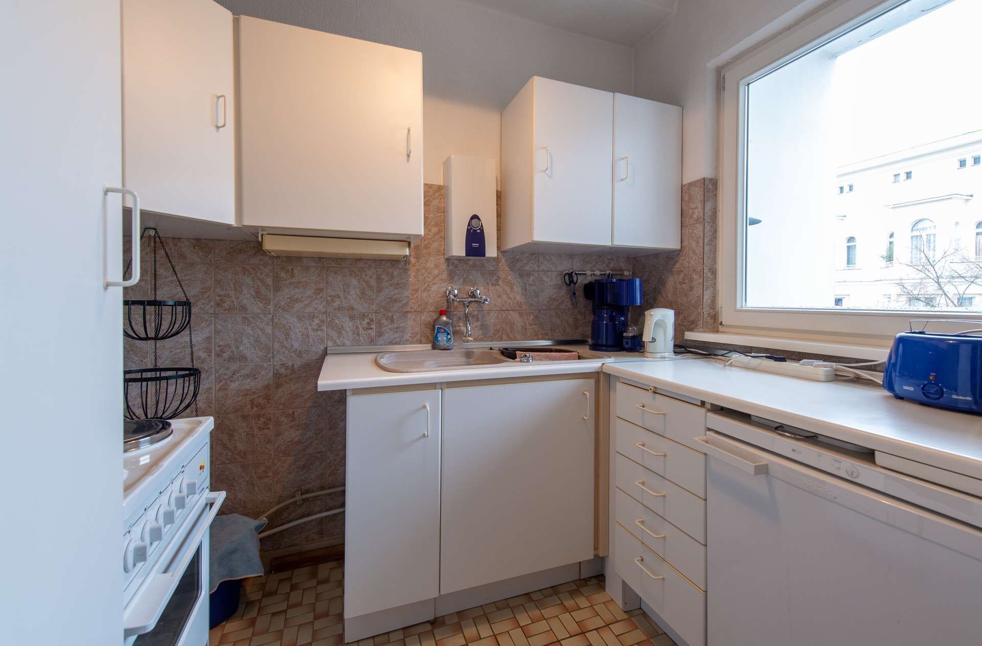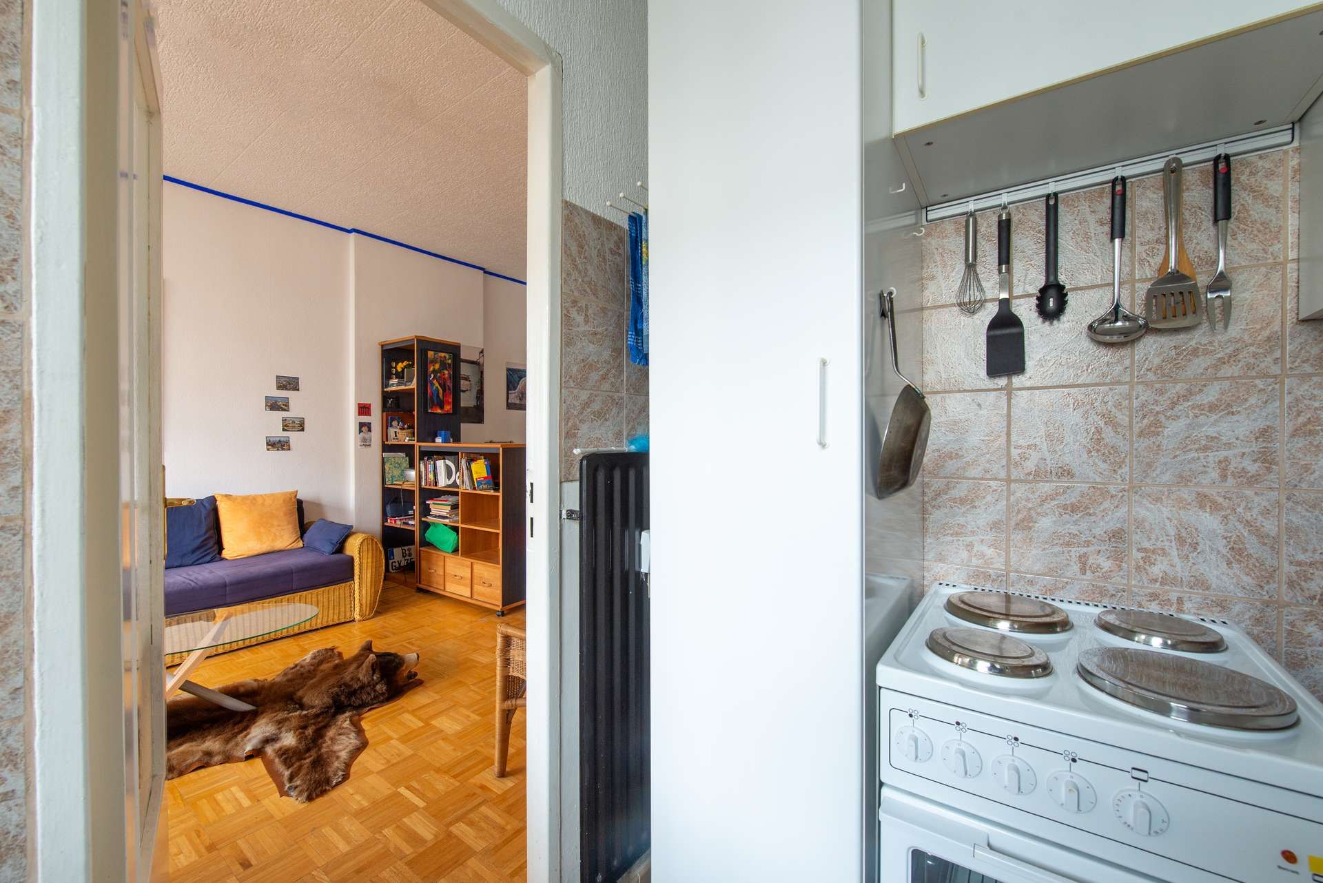 Zur Wohnung gehört eine kleine Einbauküche, die, sowie sämtliche Möbel im Preis enthalten ist. Das relativ große Kellerabteil bietet ausreichend Platz.
