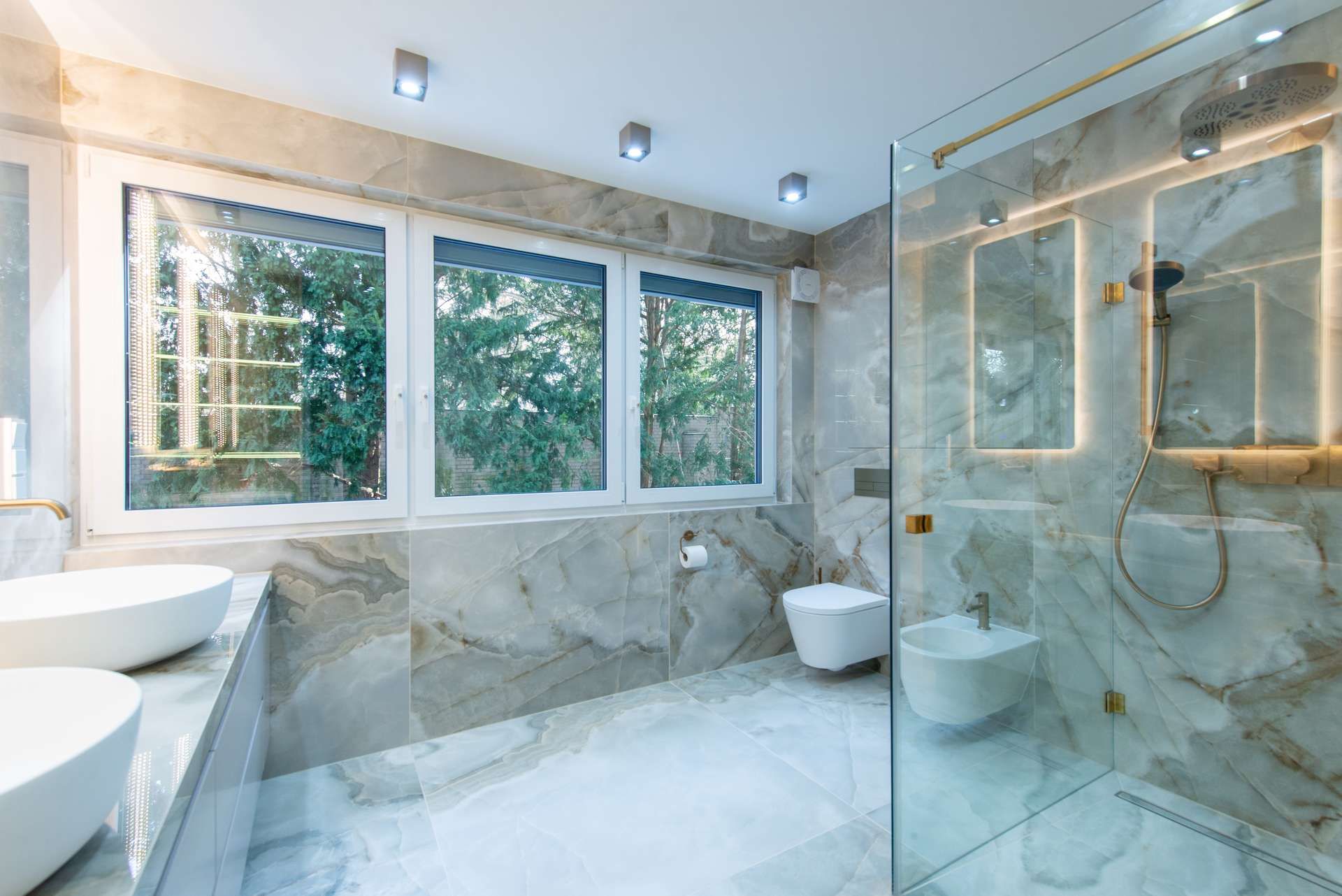 - Badezimmer mit großformatigen Fliesen, modernen Armaturen sowie hochwertige Duschlösung