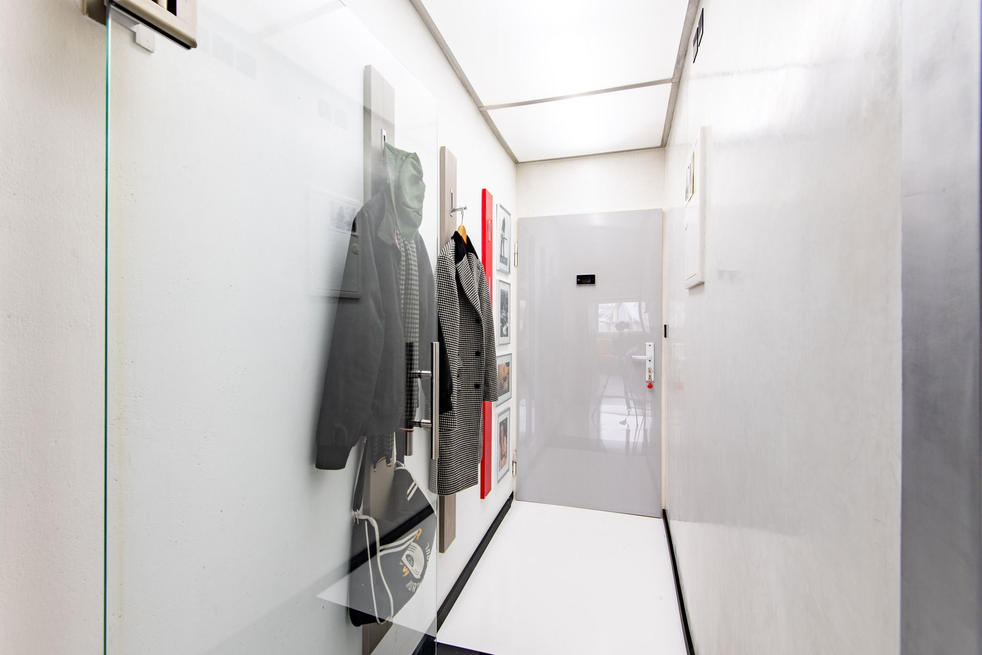 Die Wohnung ist mit einem neu verlegten Laminatboden in schwarz-weißer Lackoptik ausgestattet.