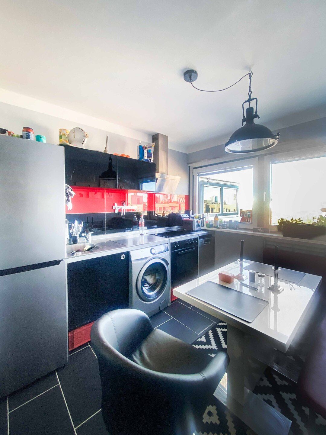 Der Küchenboden ist ebenfalls großflächig gefliest. Die Küche ist in den Farben rot und schwarz gehalten und verfügt über einen Essplatz. Die Einbauküche ist neu und modern gestaltet.