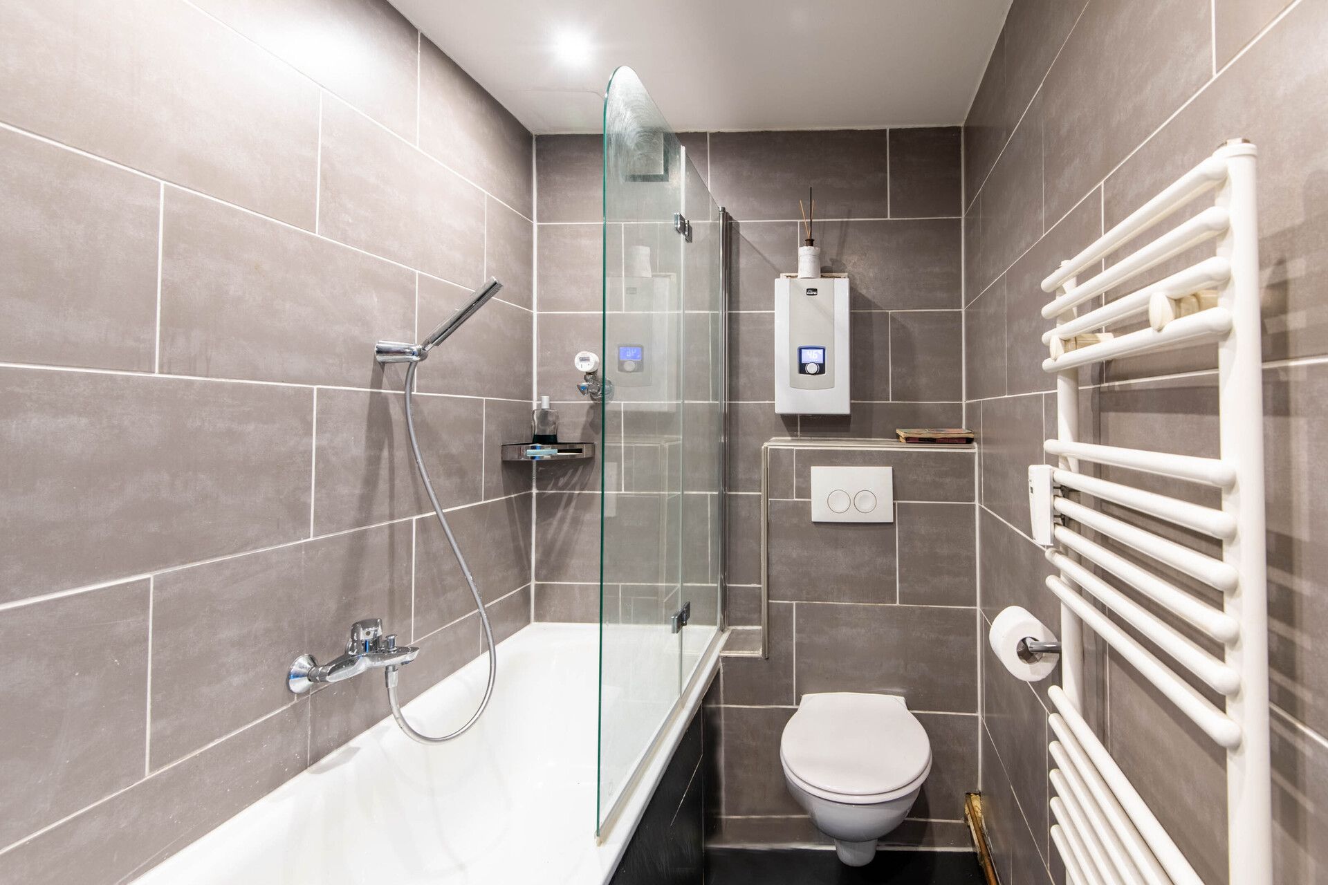 Das Bad ist modern gefliest und mit Badewanne und Duschkabine ausgestattet. Die Warmwasseraufbereitung erfolgt über einen elektrischen Durchlauferhitzer.