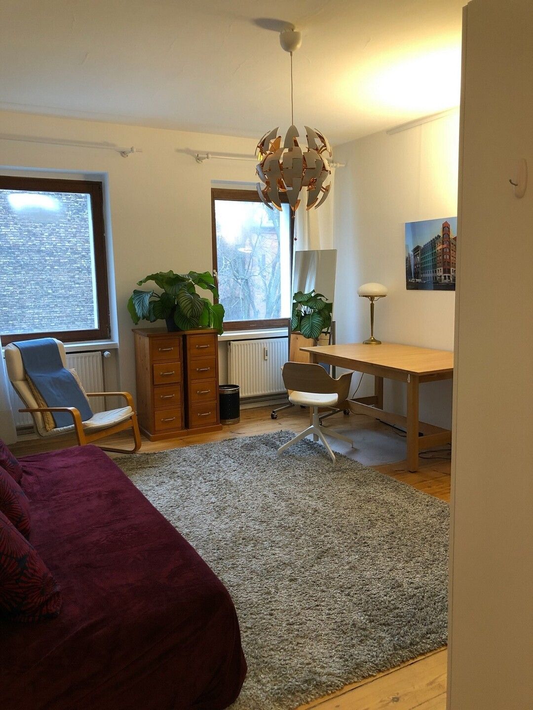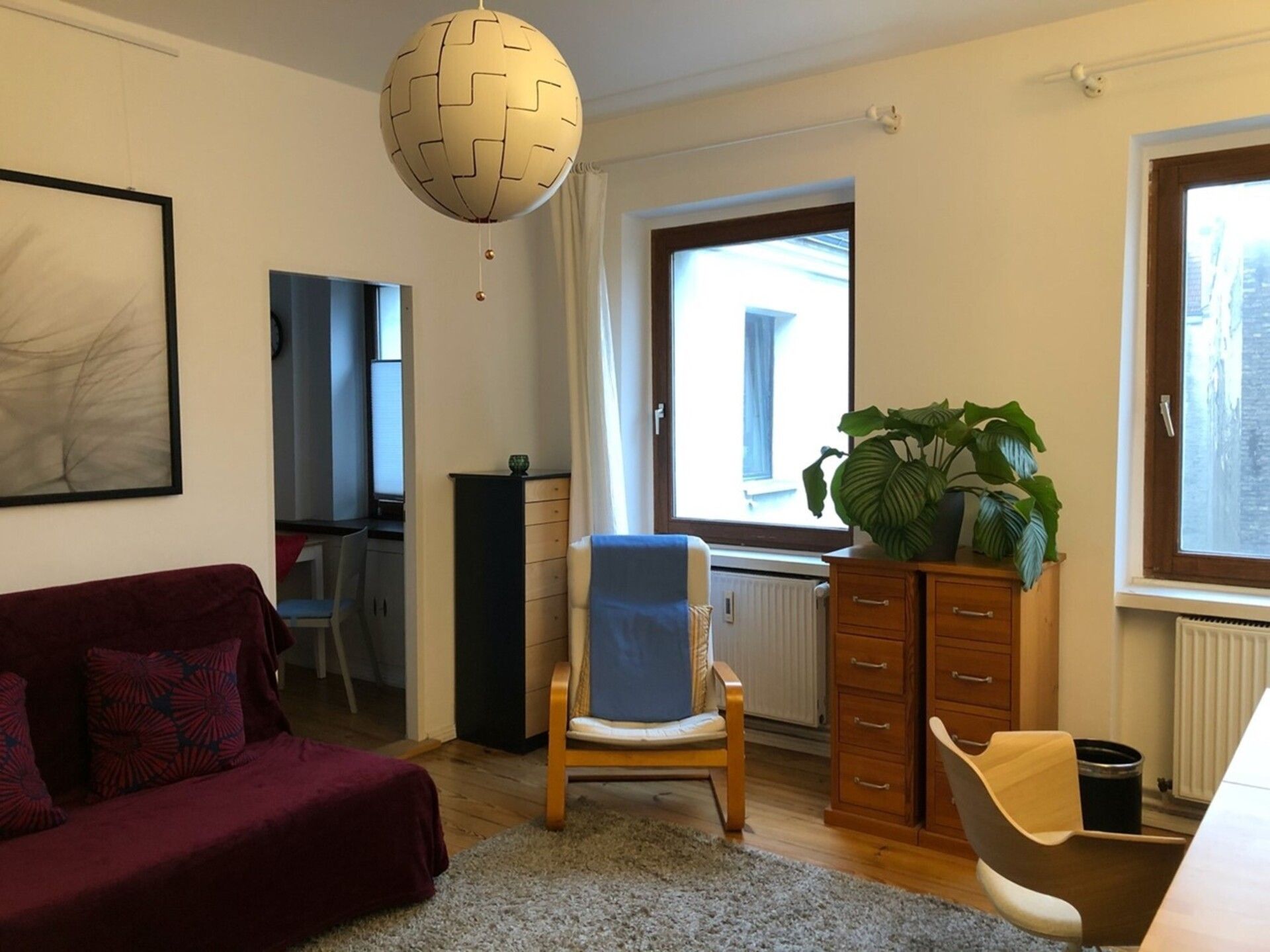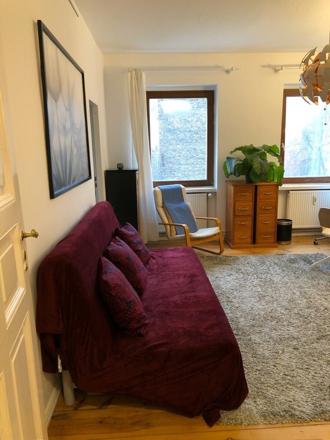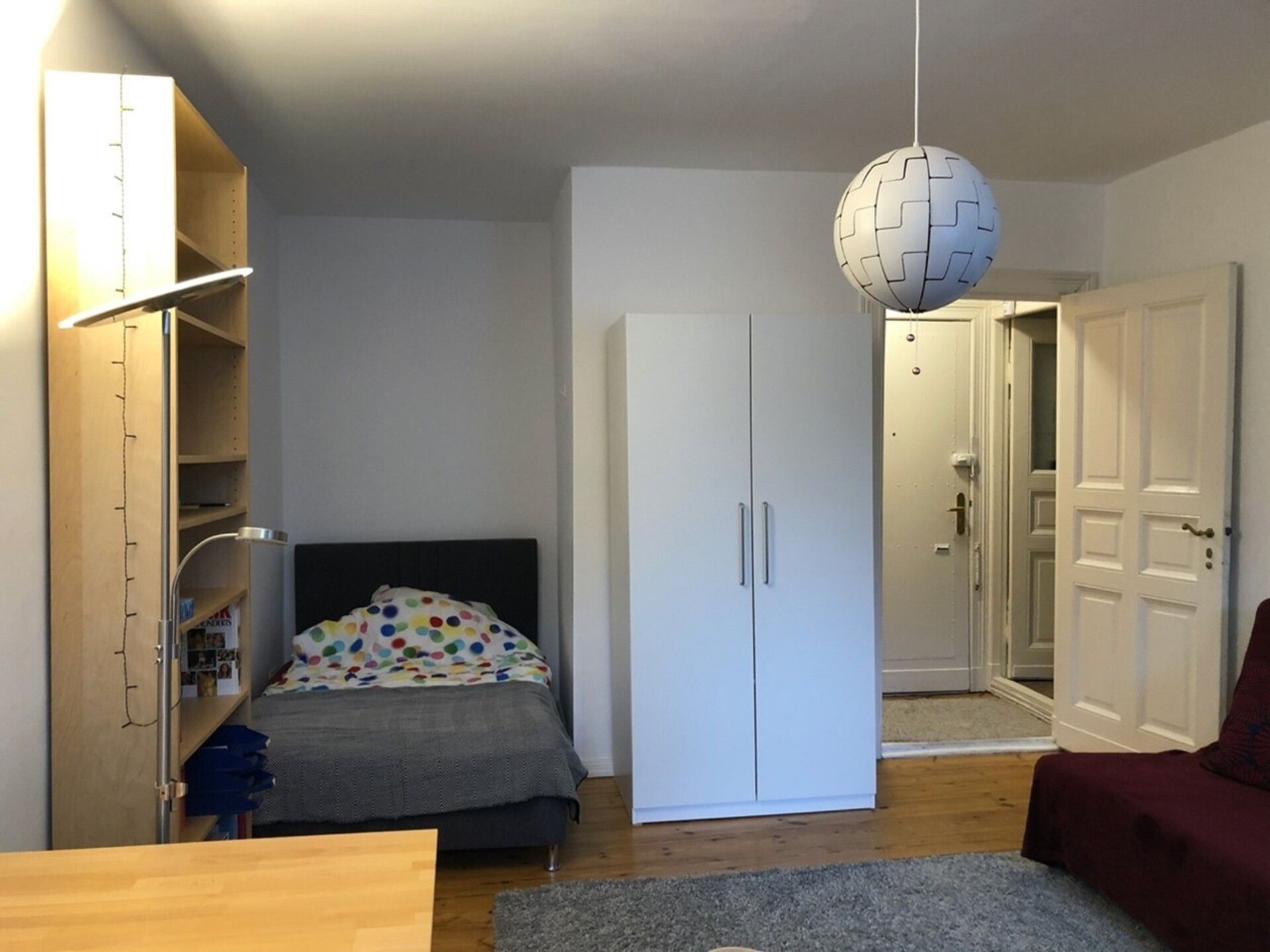 Die angebotene Wohnung befindet sich im 4. Obergeschoss im Hinterhaus eines klassischen Berliner Altbaus und verfügt über keinen Aufzug. Im Eingangsbereich der Wohnung befindet sich links das Bad und rechts eine geräumige Abstellnische mit Platz für einen schönen Einbauschrank. Das Badezimmer ist modern, geräumig und mit einer Badewanne ausgestattet. Der Wohnraum ist durch zwei große Fenster gut belichtet und bietet in der Schlafnische Platz für ein bequemes Bett. Die Küche, die sich auf der linken Seite an den Wohnraum anschließt, verfügt ebenfalls über ein schönes Fenster mit Tageslicht und bietet genügend Platz zum Kochen.
