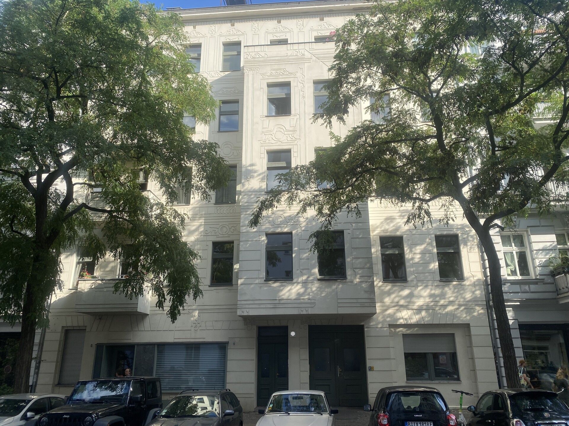 Der um 1893 errichtete Altbau erstreckt sich über fünf Geschosse und ist mit seiner sanierten Fassade ein einzigartiger Blickfang im Straßenbild. Das Wohnhaus hatte einst eine reich verzierte Stuckfassade, die nach dem Krieg zerstört wurde. Glücklicherweise fand sich eine Originalzeichnung, die die ursprüngliche Gestaltung der Gründerzeitfassade detailgetreu wiedergibt. Und genau so - und nicht anders - sollte die Fassade wiederhergestellt werden. Das renommierte Münchner Architekturbüro machte sich Gedanken, wie diese Aufgabe umzusetzen sei. Schließlich projizierten sie die Originalzeichnung im Maßstab 1:1 auf die Fassade. Wo früher Stuckornamente prangten, ziert heute ein großflächiges Relief die Außenwand des Berliner Gründerzeitbaus. Es zeigt die Zeichnung des Hauses auf dem Haus.