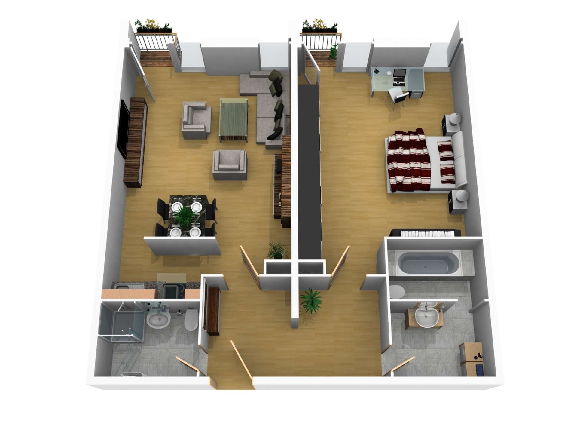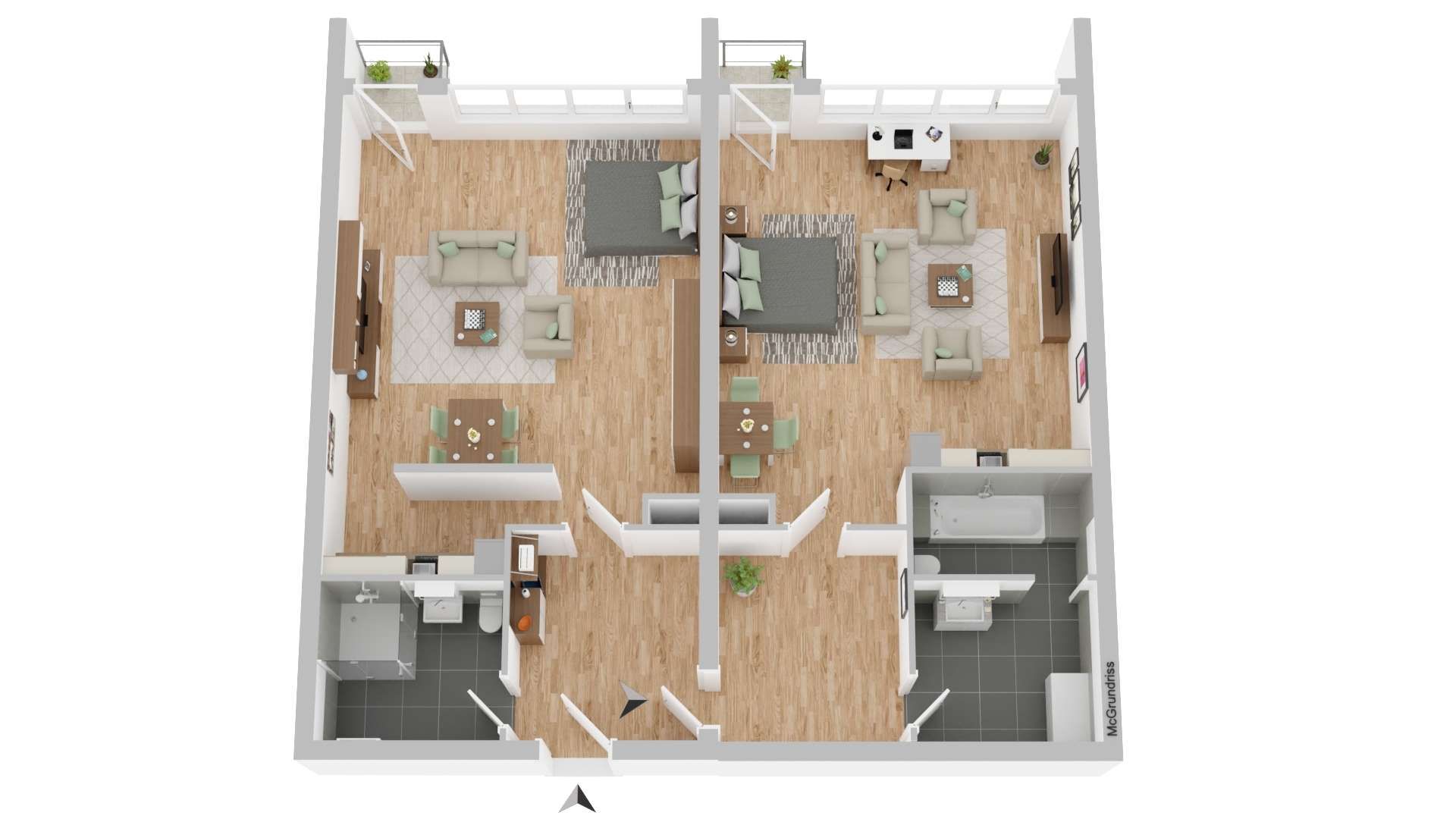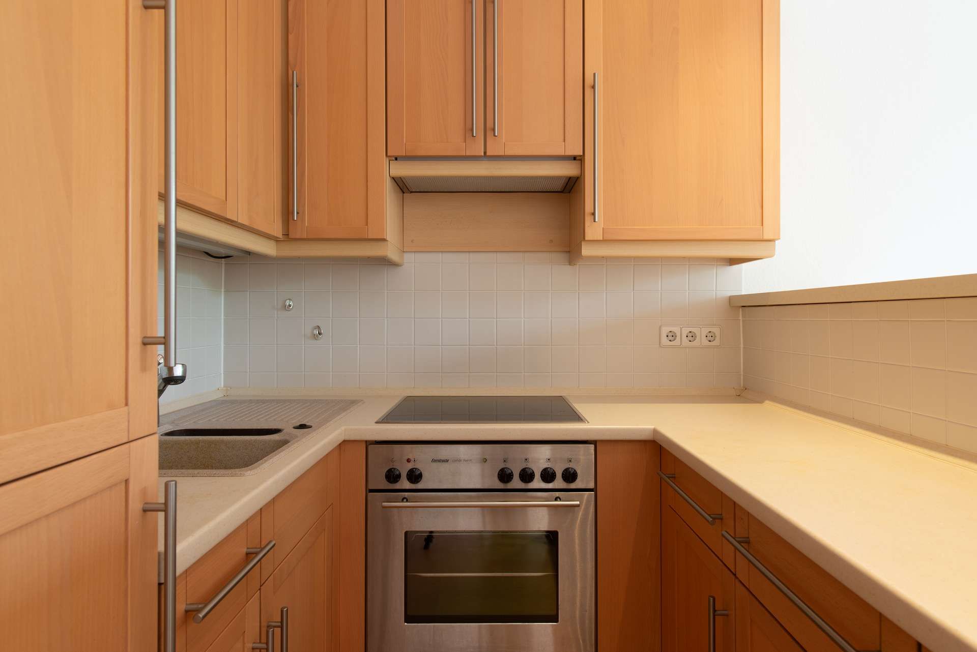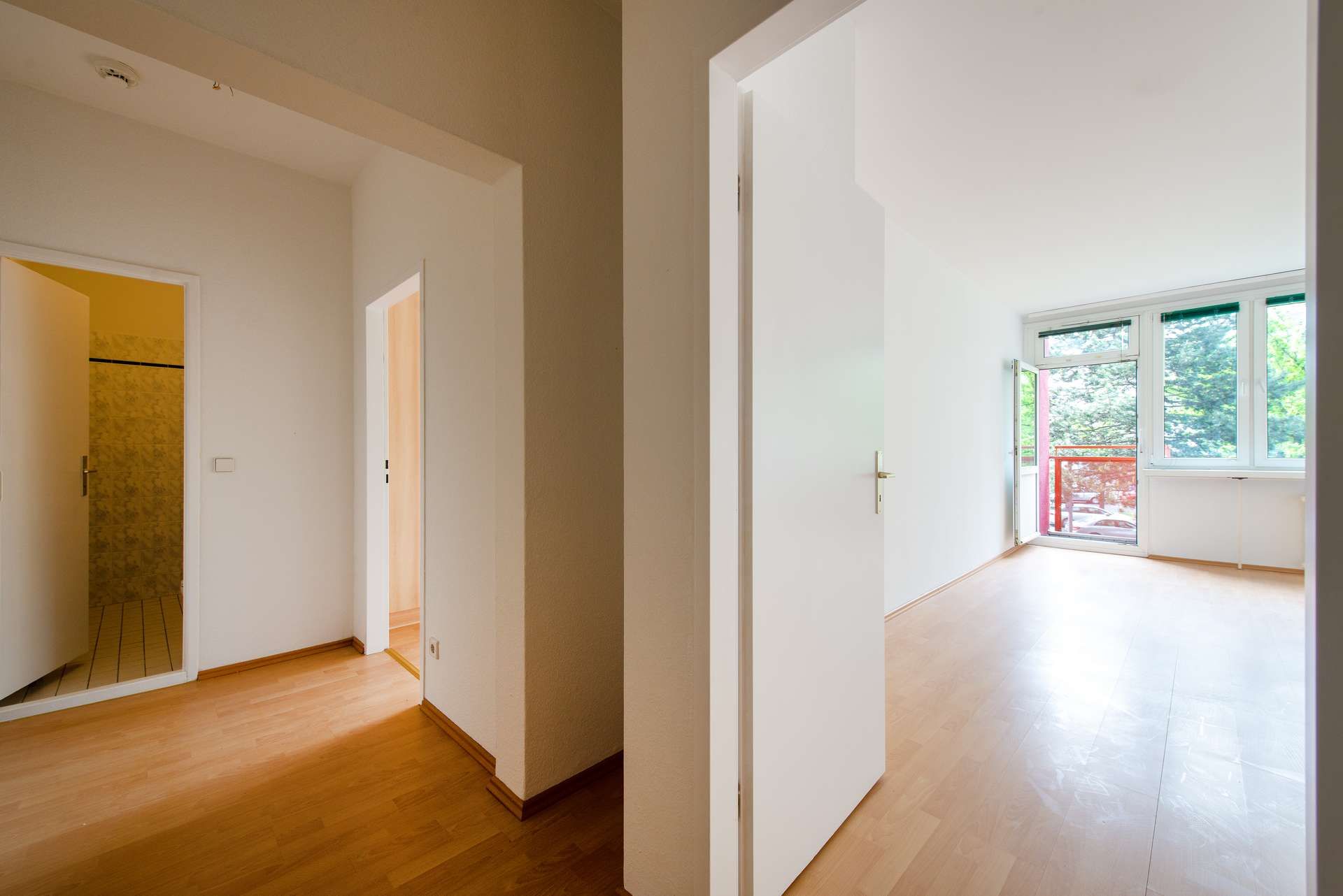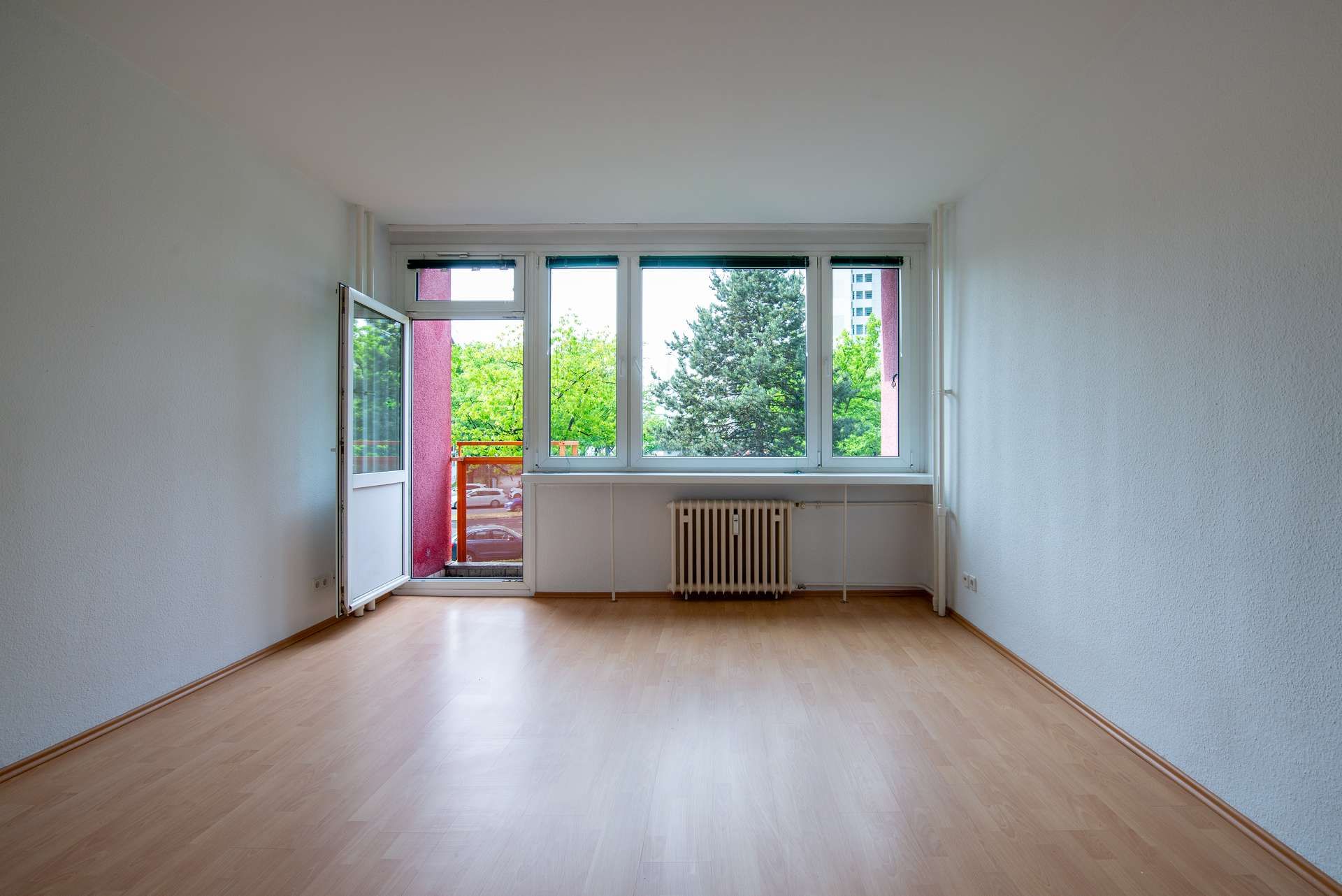 Die Wohnung verfügt über zwei große, helle Zimmer mit großer Fensterfront und jeweils einem kleinen französischen Balkon mit Südausrichtung. Die Wohnung ist bequem mit dem Aufzug zu erreichen. Sie verfügt über eine praktische Einbauküche. Das Bad ist innenliegend und mit einer Badewanne ausgestattet. Das zweite Bad war ursprünglich mit einer Dusche ausgestattet. Heute wird es hauptsächlich als Gäste-WC genutzt und bietet daher ausreichend Platz für Waschmaschine und Trockner. Zur Wohnung gehören zwei Kellerabteile.